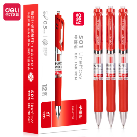 商品名稱:得力S01 紅色中性筆 簽字筆 0.5mm子彈頭經(jīng)典辦公按動(dòng)筆水筆 12支/盒