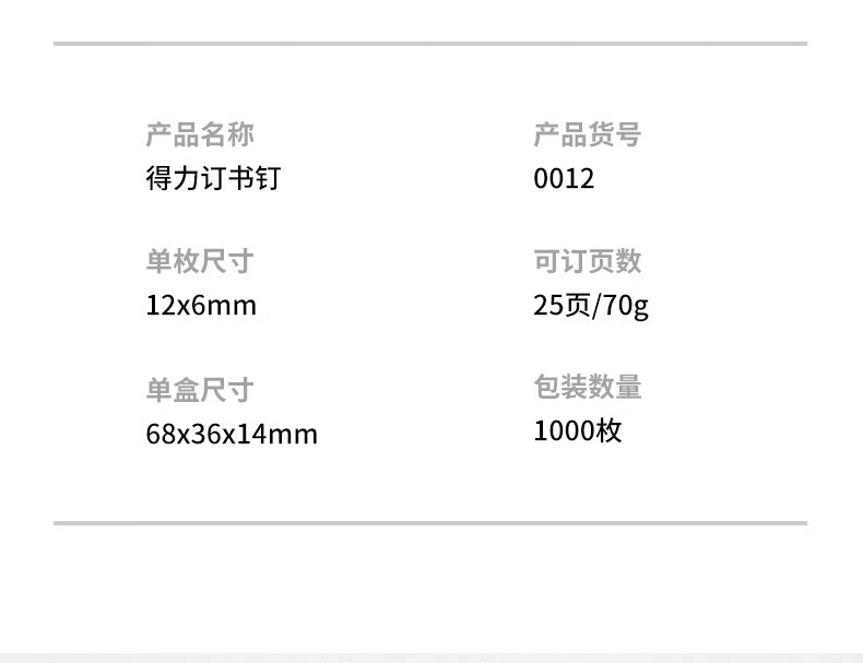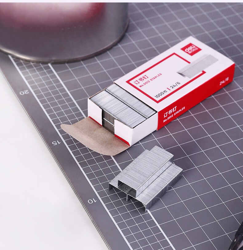 商品名稱:得力0012 高強(qiáng)度訂書釘 12#24/6訂書針 可訂25頁 1000枚/盒