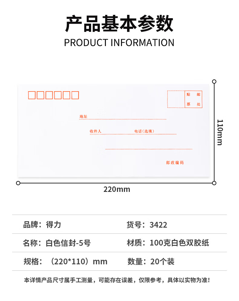 商品名稱:得力3422 白色信封 5號(hào)郵局標(biāo)準(zhǔn)信封220*110mm 20張/包
