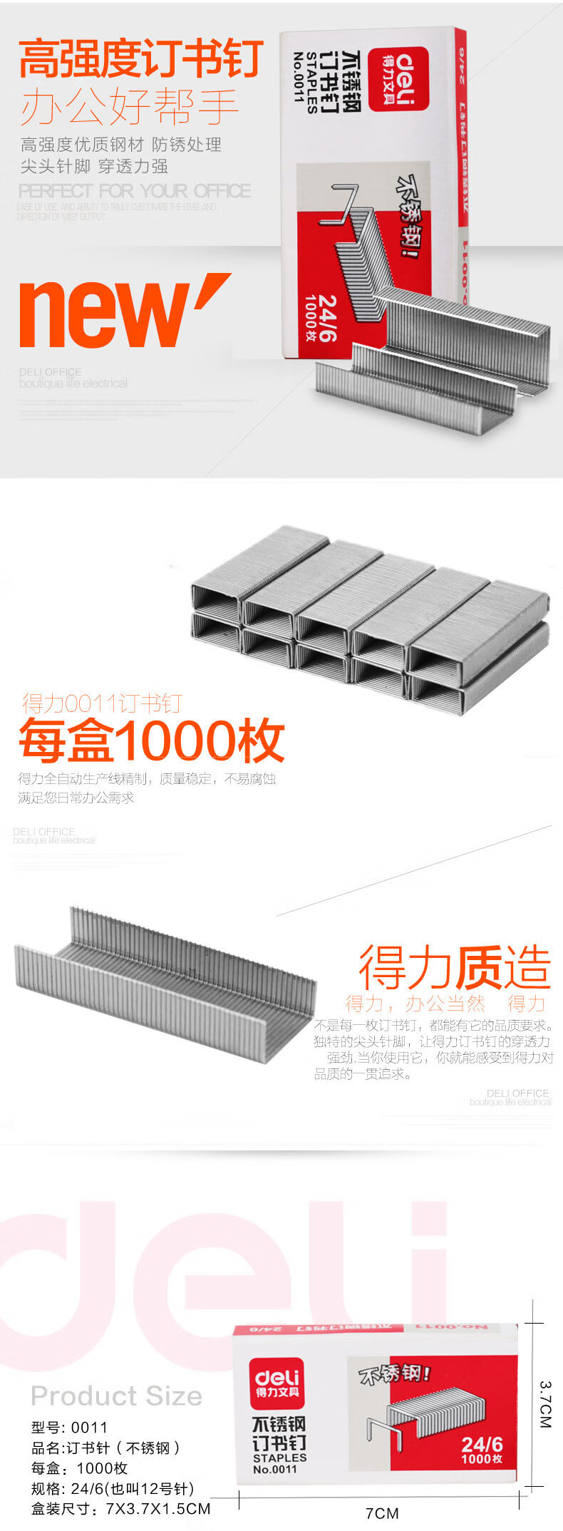 商品名稱:得力0011 不銹鋼訂書釘 24/6訂書針 1000枚/盒 單盒裝