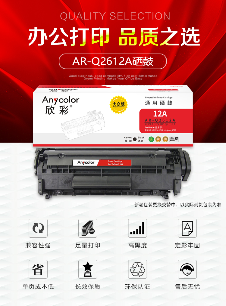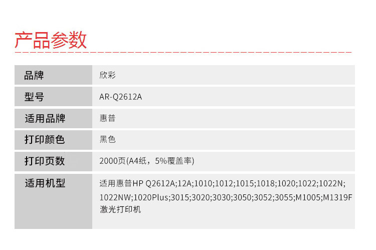 商品名稱:欣彩AR-Q2612A硒鼓 大眾版 適用惠普HP Q2612A 12A 1010 1012 1015 1018 1020 1022 1022N 1022NW激光打印機