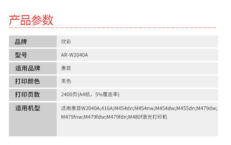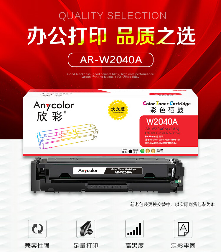 商品名稱:欣彩AR-W2040A黑色硒鼓 大眾版帶芯片 適用惠普W2040A 416A M454dn M454nw M454dw M455dn M479dw激光打印機(jī)