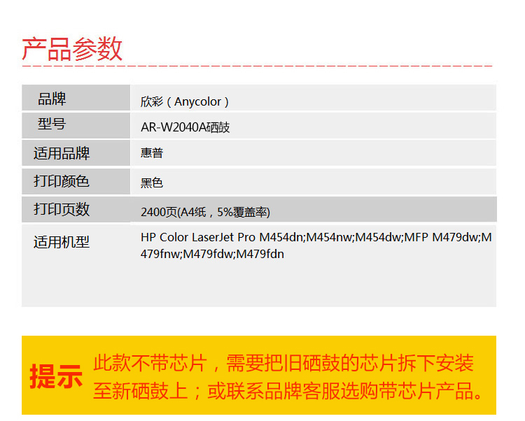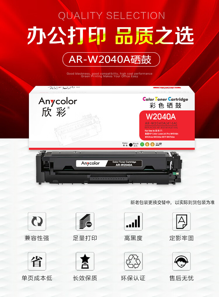 商品名稱:欣彩W2040A硒鼓 AR-W2040A黑色 416A不帶芯片 適用惠普M454dn M454nw M479dw M479fnw fdw fdn