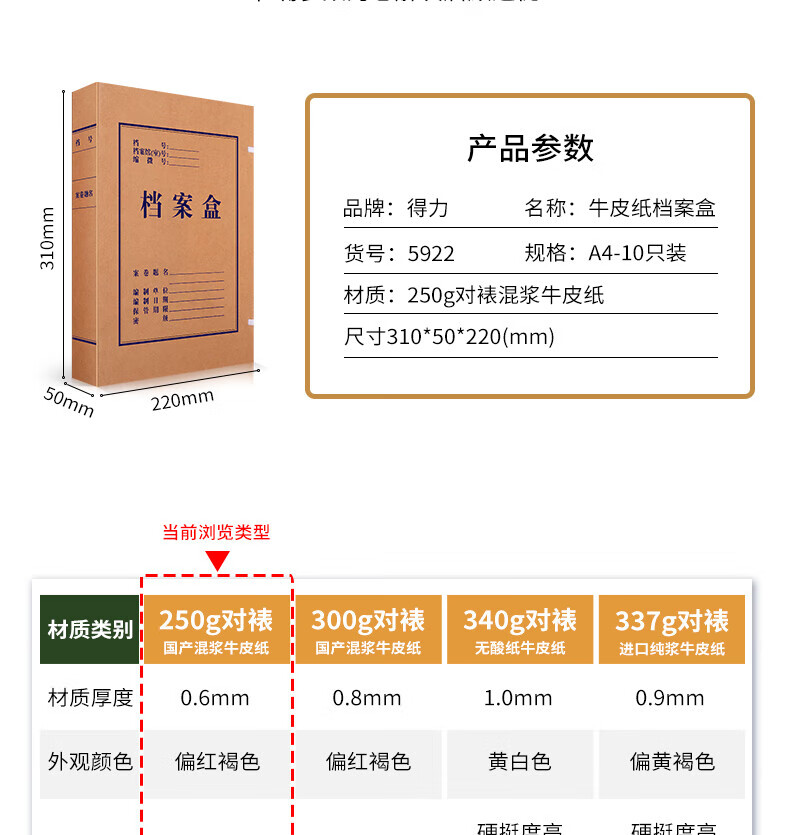 商品名稱:得力5922 牛皮紙檔案盒 50mm250g加厚財(cái)務(wù)憑證文件盒 10只/包