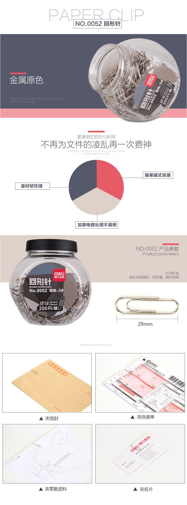 商品名稱:得力0052 鍍鎳回形針 3號(hào)29mm金屬防銹曲別針 辦公用品 200只/桶