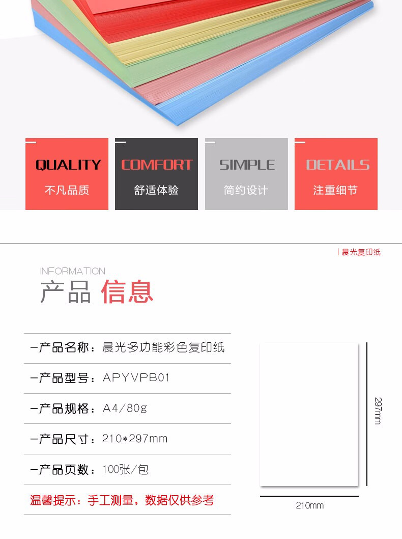 商品名稱(chēng):晨光A4/80g彩色多功能打印紙 手工紙復(fù)印紙 100張/袋APYVPB0131