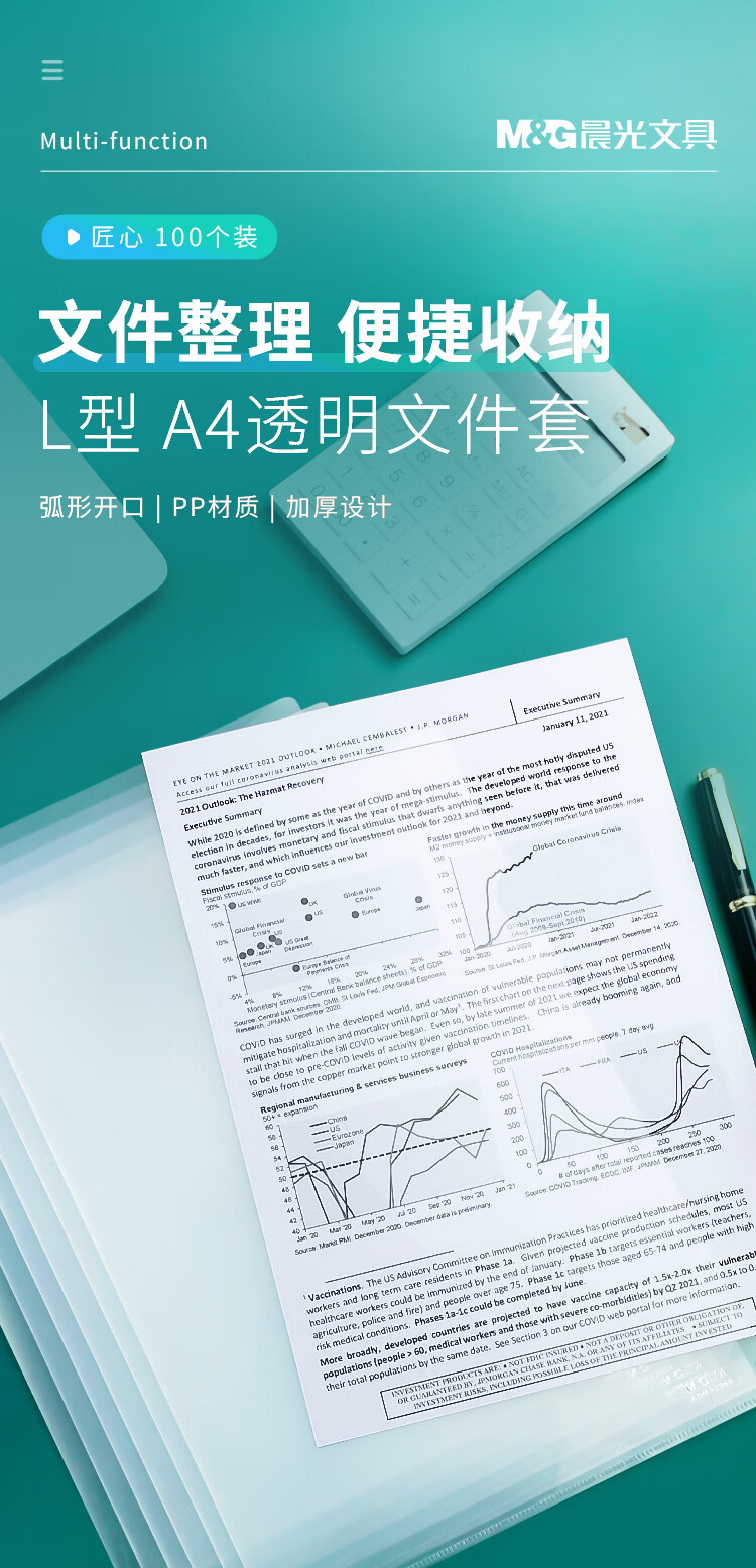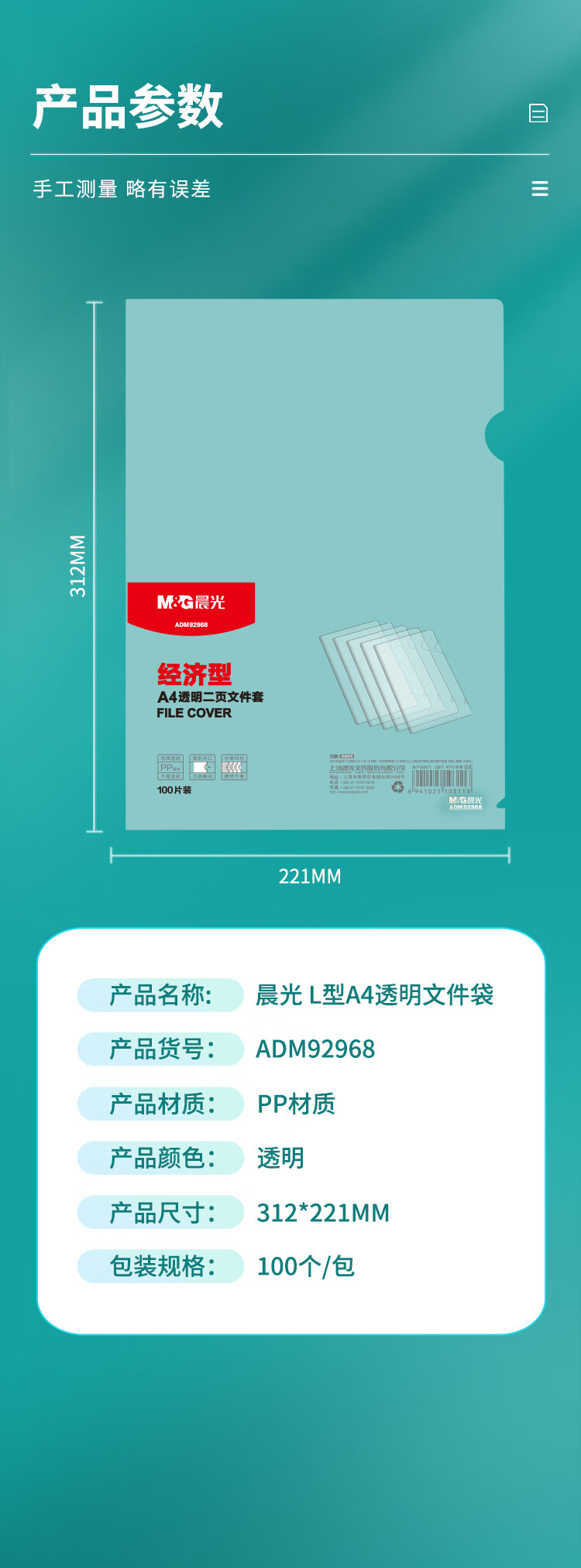 商品名稱:晨光A4透明L型文件袋 防塵防水單片夾資料保護袋 100片/包ADM92968