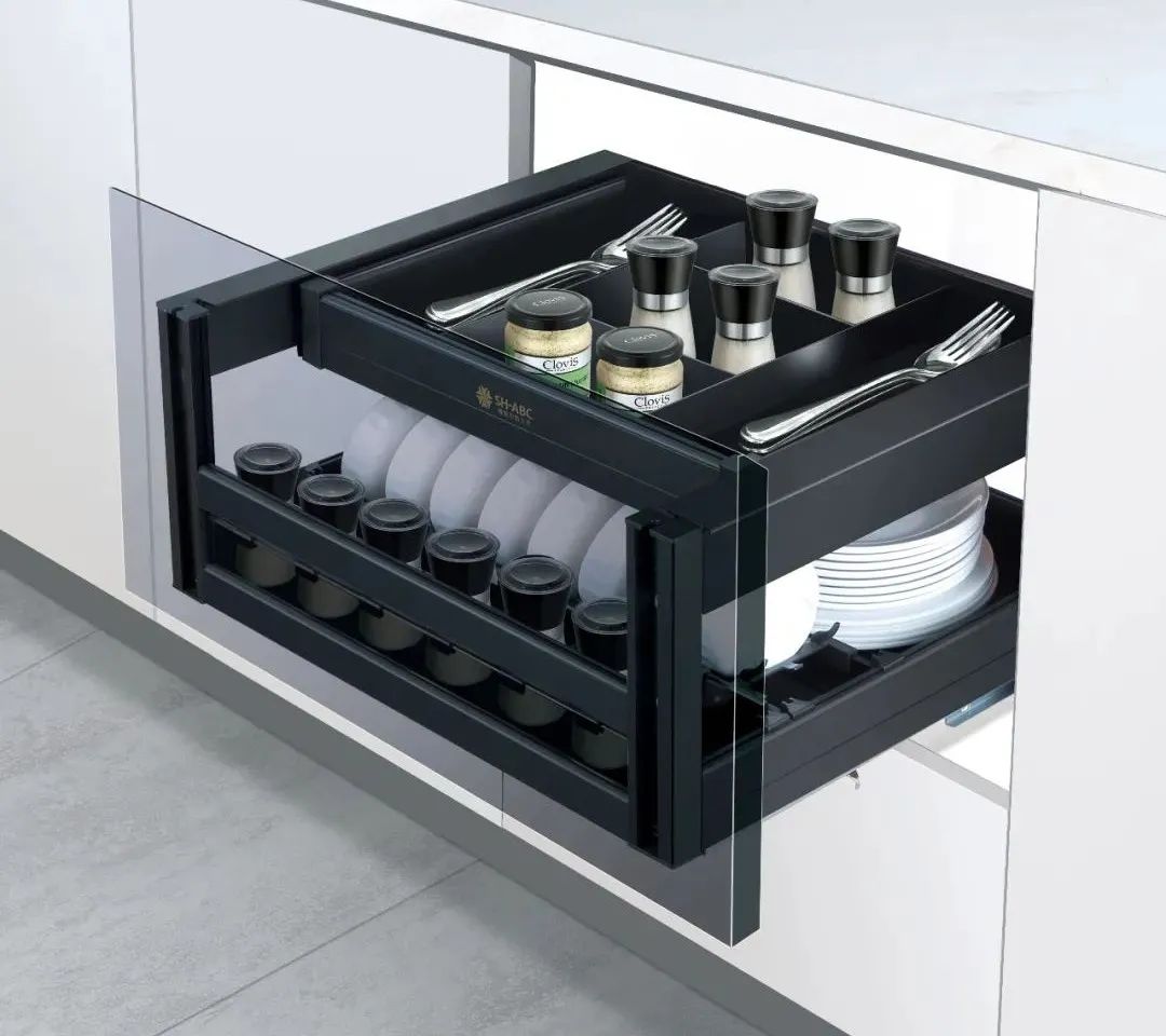 在廚房功能五金區(qū)域,星徽精密展出了全鋁星耀系列產(chǎn)品,簡(jiǎn)約的設(shè)計(jì)加上采用全鋁與鋼化玻璃的組合,精細(xì)的做工,盡顯全鋁拉籃的輕奢高級(jí)。
